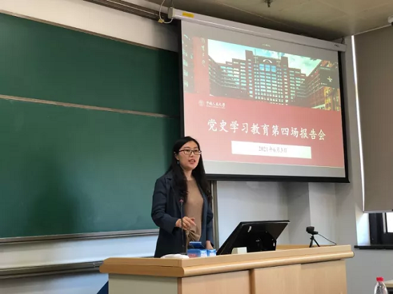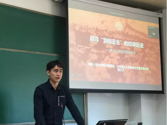 6月3日中午,政治经济学第二联合党支部、第一联合党支部和世经国贸博士联合党支部在明德商学楼0104教室举行以“追寻前辈足迹,赓续红色基因”为主题的党史学习教育第四场报告会。h视频 党委副书记、指导老师李佩洁同志参会,会议由支部书记王声啸同志主持。来自h视频 延河讲师团讲师雷引杰、何佩熹、马浩涵结合自身体会,从“到延安去”的信仰足迹、“抗美援朝”的金刚川事迹和人大校友吴玉章和胡福明的感人事迹三个方面分享,收到了良好的效果。大家纷纷表示作为当代青年,铭记奋斗历史、传承先辈精神、成为时代新人,义不容辞。
