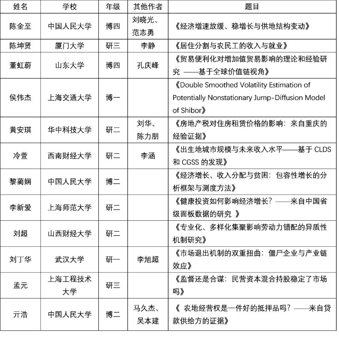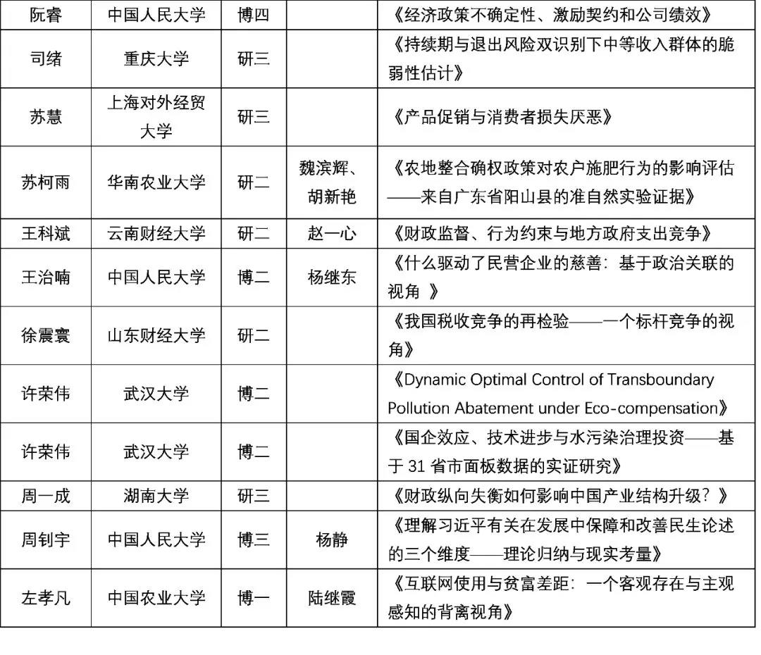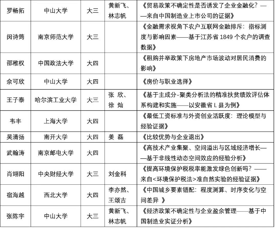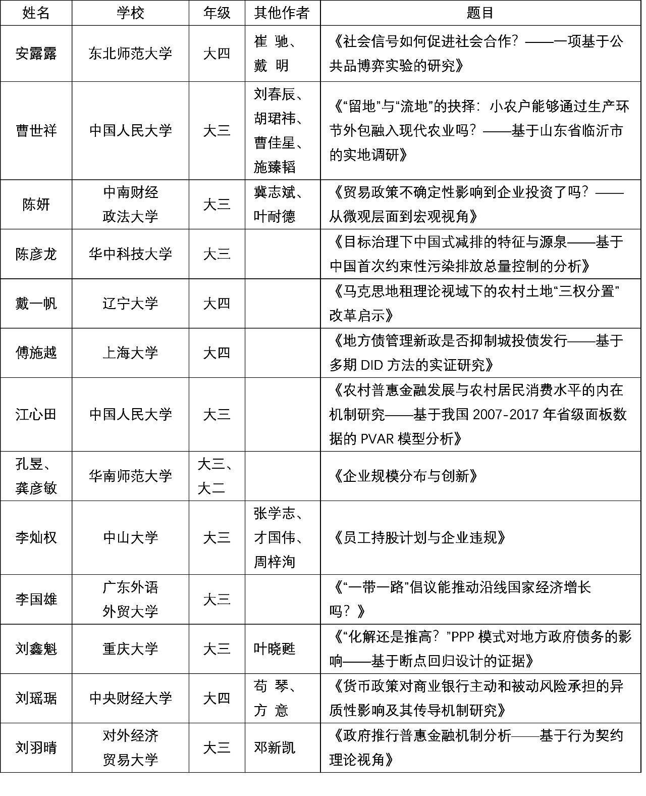 自2019年9月征稿以来,全国各高校的经济学领域学生积极投稿,大学生论坛和研究生论坛共收到241篇投稿作品。经过论坛评审组委会充分酝酿评选,最终评选出了入围名单,大学生论坛和研究生论坛各有24篇作品入选一等奖奖金5000元,二等奖奖金3000元,三等奖2000元。在此特别鸣谢90级经济系校友捐赠设立“经英杯”学生成长基金。具体奖项将在颁奖现场直接揭晓获奖名单!现将入围作品名单公布如下(以下按姓氏首字母顺序排列):