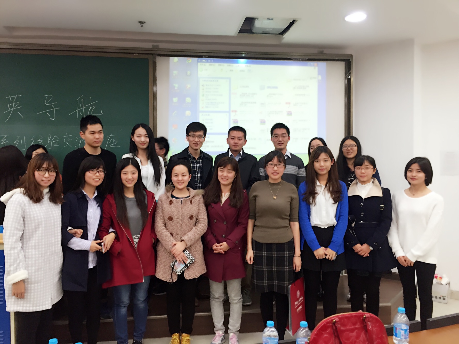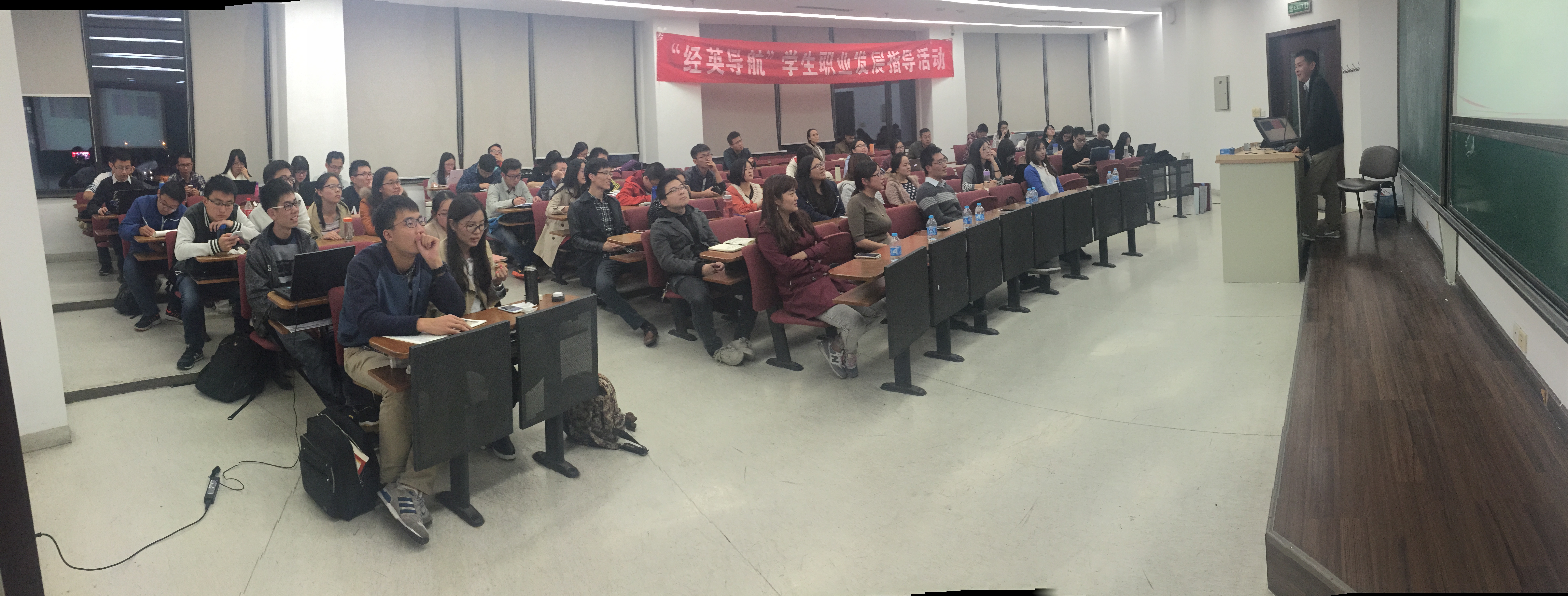 20151025日晚, 新一季“经英导航”求职指导讲座之银行国企篇在明商0202拉开帷幕。本次活动邀请了来自中国进出口银行的孙杉院友、来自中国民生银行总行营业部的谭维晋院友、来自中国水电建设集团国际工程有限公司的李策院友,以及来自中国五矿集团公司的康子冉院友。四位青年院友为本院同学做了详实而生动的解读。