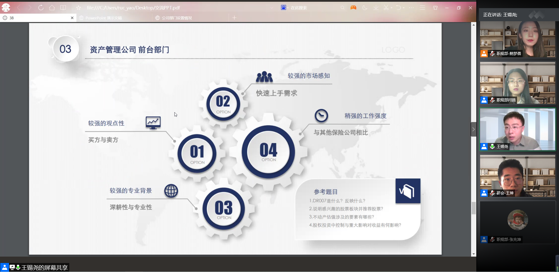 王锡尧师兄从再保险基础、保险资管、能力需求与求职经验三个方面带来了自己的分享。在再保险基础方面,师兄介绍了再保险的基本概念、再保险的分类以及目前再保险市场现状。在保险资产管理方面,师兄首先清楚阐述了保险资产管理公司不同部门的职能,然后从资产配置、偿付能力管理与资产负债管理,管理人选聘与选择、绩效评估与投资合规等方面介绍了保险公司资产管理部的工作。在能力需求与求职经验方面,师兄认为求职者首先要有较强的专业背景与知识储备,要具备深耕性与专业性;其次是需要有较强的观点性,要有基础的市场知识与感知;最后,还要适应较强的工作强度。