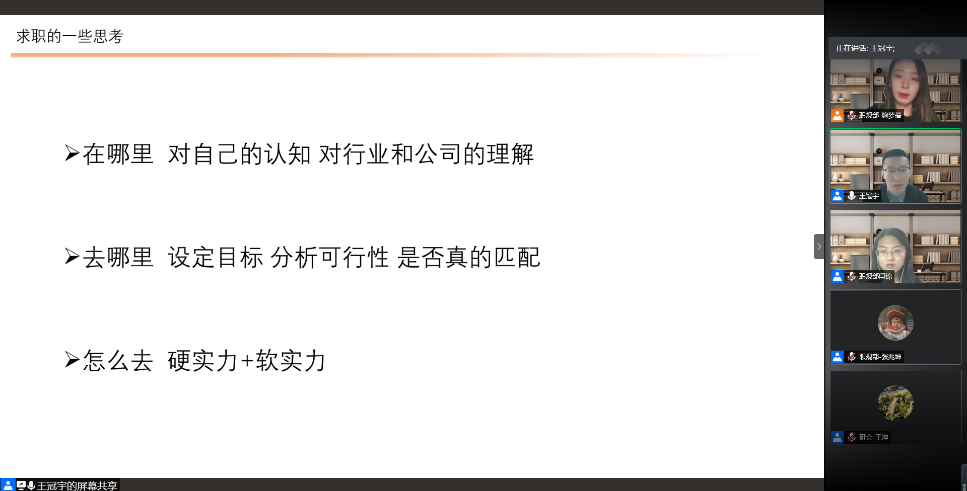 在经验分享环节,第一位嘉宾王冠宇师兄从行业与岗位介绍和求职经验与建议两个方面进行了介绍。首先,在行业与岗位介绍方面,师兄分享了自己对于保险行业的认识与了解。师兄从介绍保险定义与保险公司分类开始,详细介绍了目前人身险公司、财产险公司、保险资产管理公司等的主营业务、利润来源以及目前招聘岗位。在求职经验与建议方面,王冠宇师兄从“在哪里,去哪里,怎么去”三个角度分享了自己的思考。首先是“在哪里”角度,师兄建议不仅要对自己有清楚明确的认知,还要深入了解行业与公司,对保险有一个全面整体的理解;其次是“去哪里”,师兄认为在求职中要根据性格、爱好、工作发展机会和薪酬等设立一个具体可行的目标,避免盲目随大流,减少海投;最后在“怎么去”方面,师兄建议提升自身的硬实力与软实力。最后,王冠宇师兄用“多了解多尝试多复盘”作为自己的求职经验总结。
