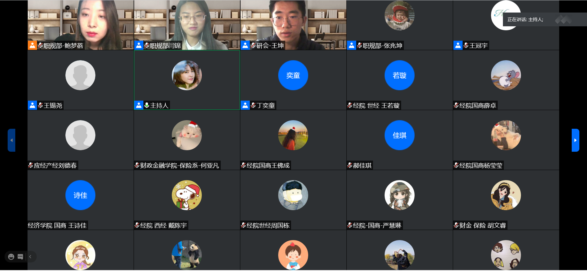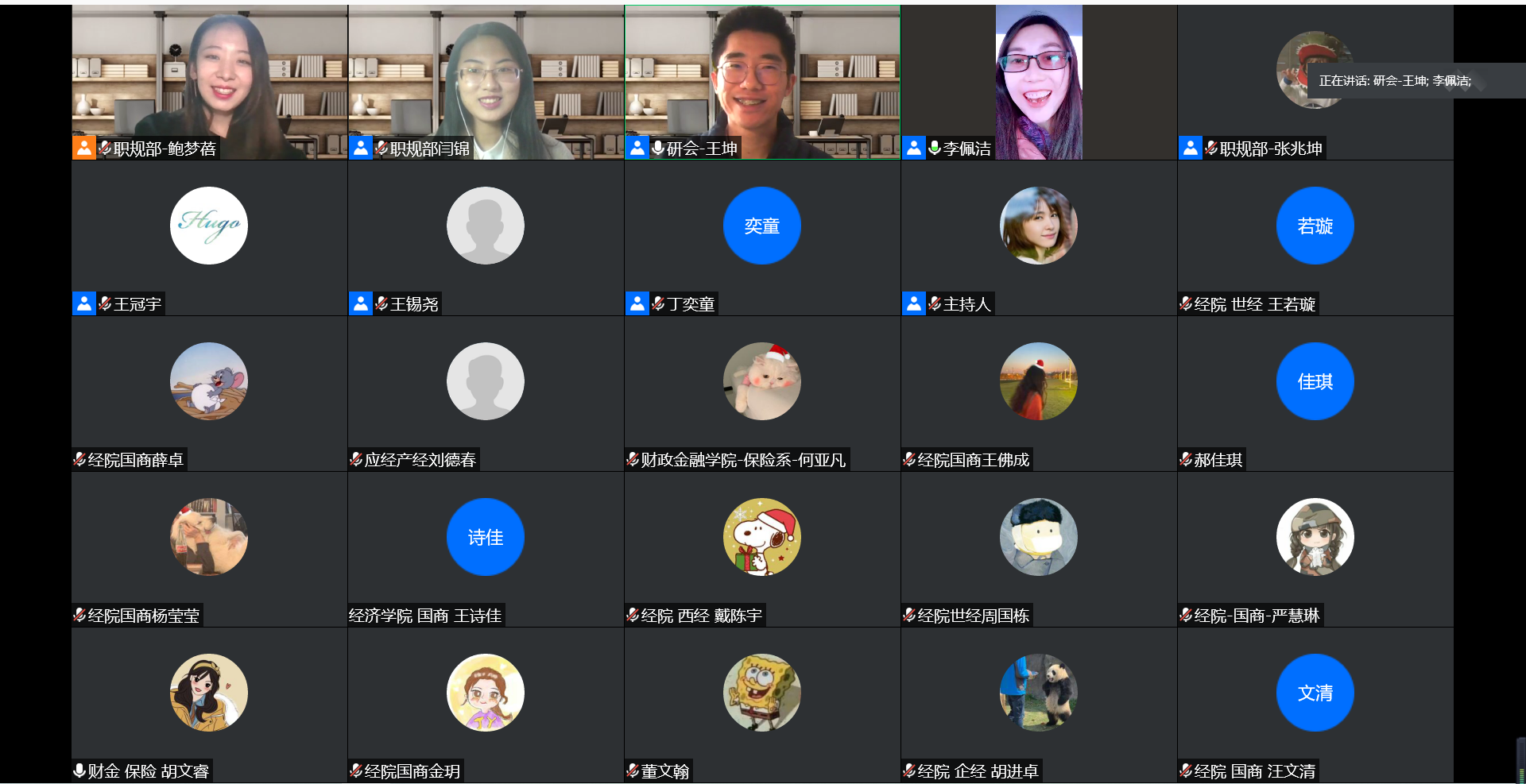 3月21日下午,h视频 团委主办、h视频 研究生会承办的2021“经英导航”系列经验交流讲座之保险行业篇于线上顺利举行。本次会议由2020级国际商务传统方向硕士研究生鲍梦蓓主持,邀请到现就职于中国人寿保险(集团)公司战略规划部王冠宇现就职于中国出口信用保险公司客户管理和市场开发部的高美洁和现就职于中国财产再保险公司资产管理部、中再资产管理公司固定收益部的王锡尧进行经验分享。h视频 党委副书记李佩洁老师、团委书记程万昕老师党团学办公室林塘城老师参加本次活动,近50名来自多个学院、专业的同学线上聆听了此次讲座。