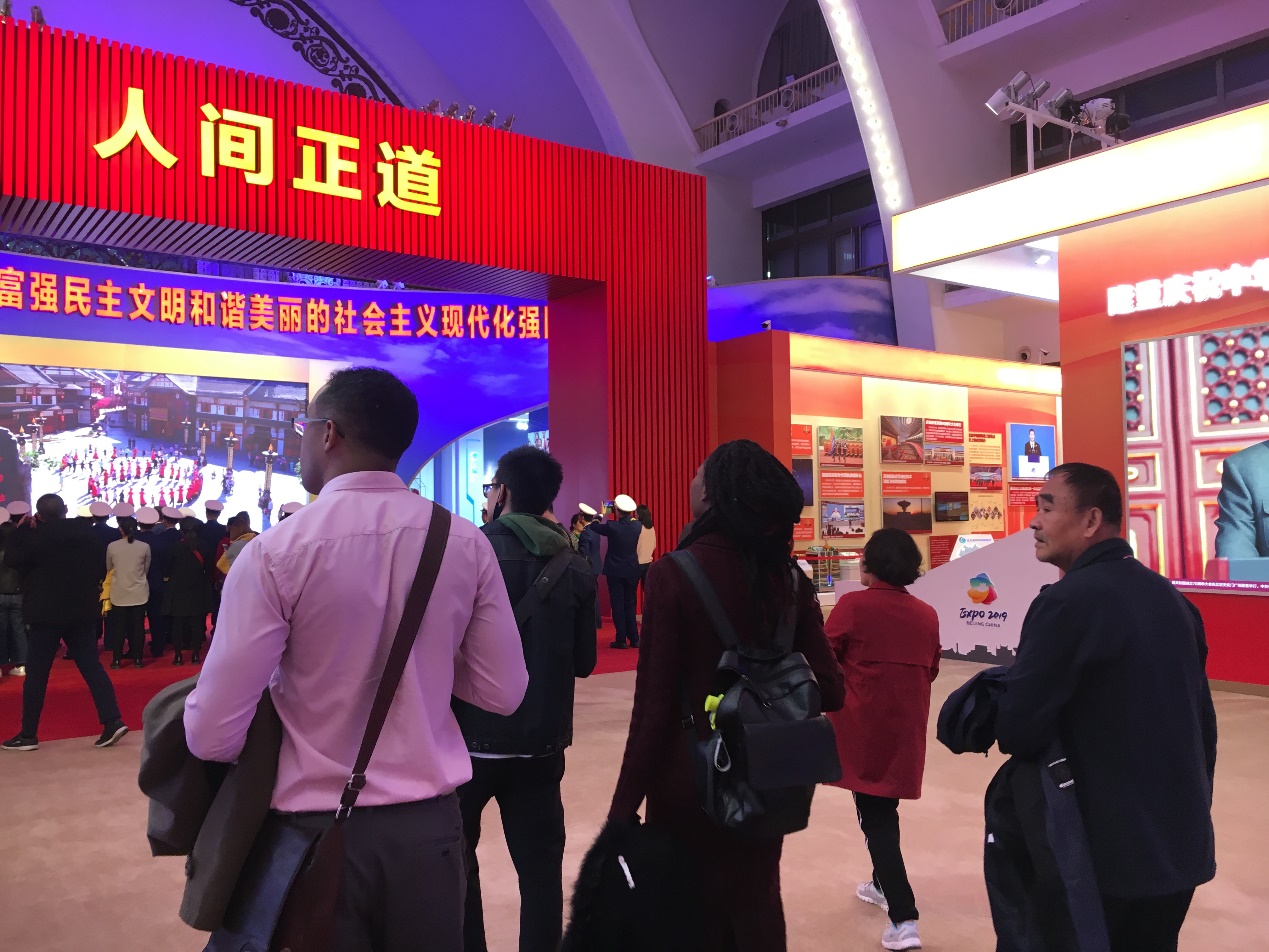 h视频 商务部援外项目之一——中国经济硕士班的部分成员也跟随着h视频 的师生党员一同观展。一张张照片、一件件展品向他们展现了中华民族从站起来、富起来到强起来的伟大历程,加深了他们对新中国70年发展成就的了解。