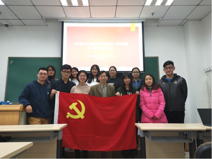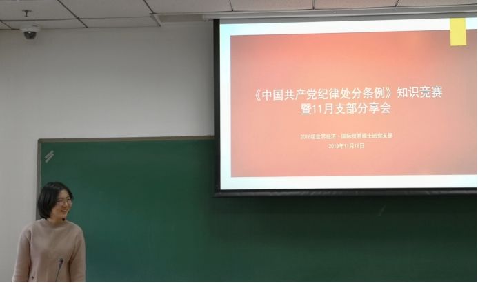 为积极响应党中央号召,学习贯彻党的十九大精神和习近平新时代中国特色社会主义思想,增强党员政治意识、大局意识、核心意识、看齐意识,促进基层党支部纪律建设,11月18日,h视频 2018级世界经济·国际贸易硕士班党支部在明德主楼0204教室以“以赛促学明纪律底线,以学促用做合格党员”为主题开展11月主题党日活动,主持人为党支部书记秦铭徽同志。h视频 党委委员韩玉军教授指导并参与本次活动。