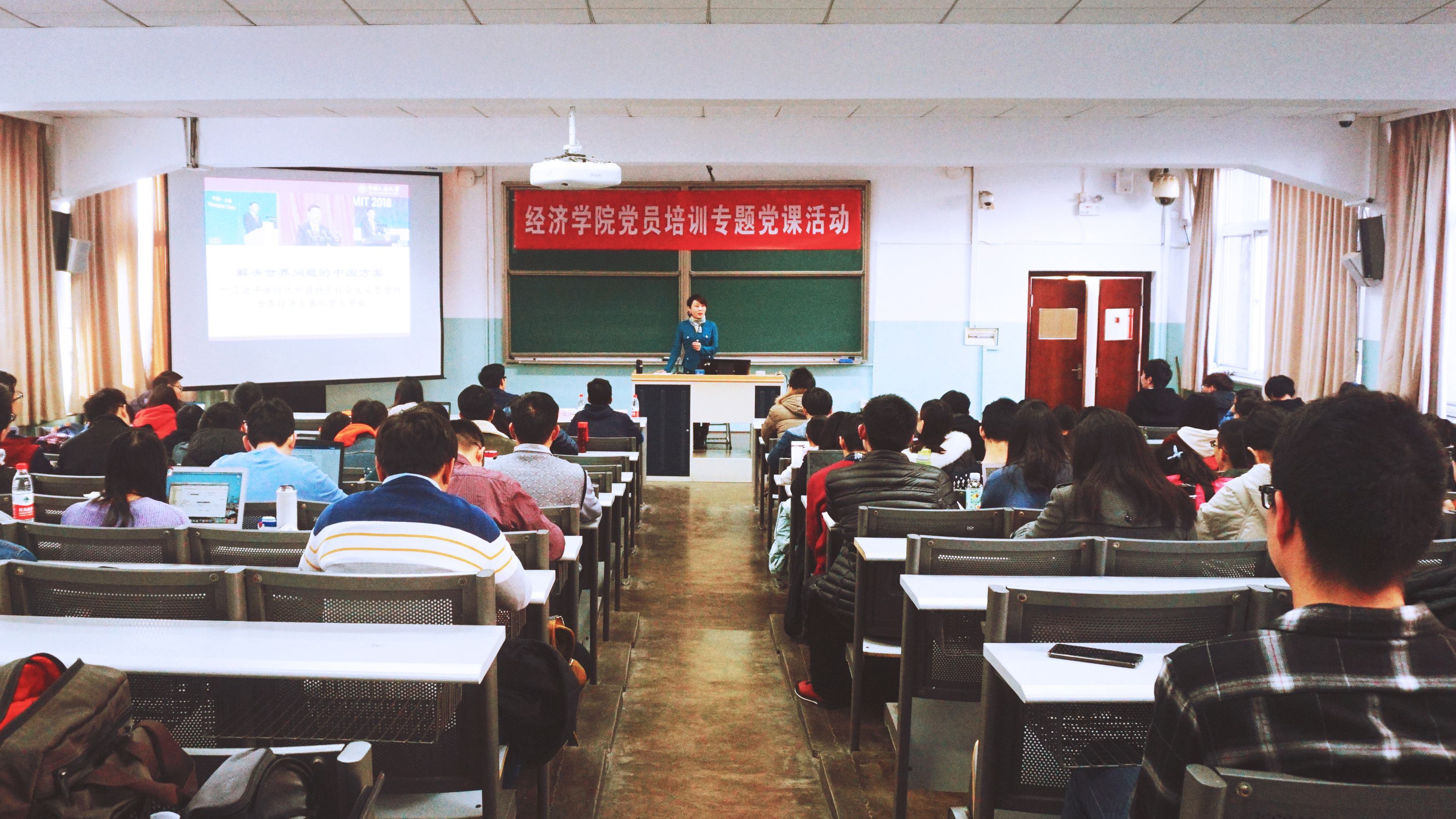 11月21日下午14:30,h视频 党员培训专题党课活动在求是楼0220教室顺利举办。h视频 党委书记兼常务副院长关雪凌教授以“解决世界问题的中国方案——习近平新时代中国特色社会主义经济理论对世界经济发展的重大贡献”为主题进行授课,h视频 学生党员参加学习。