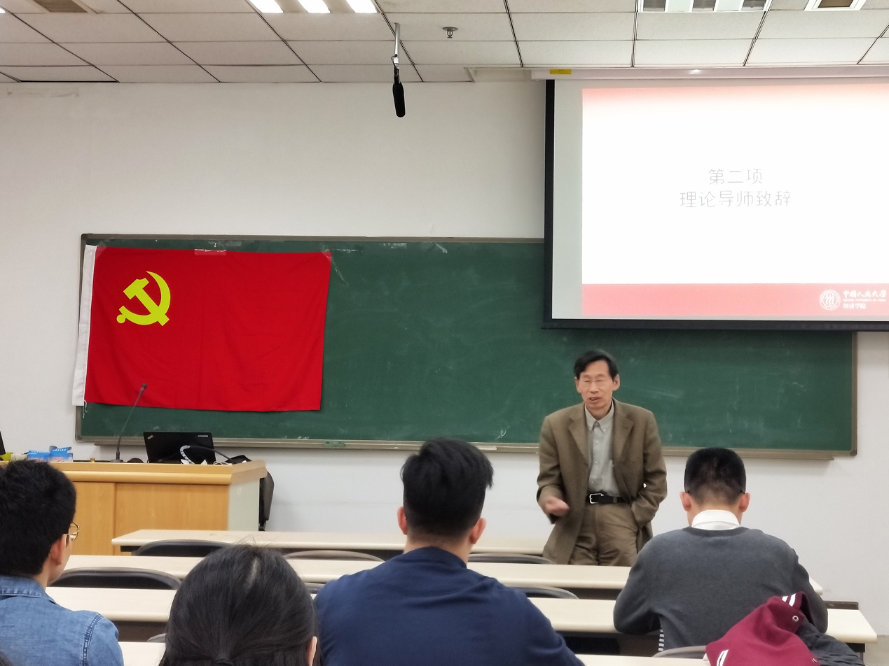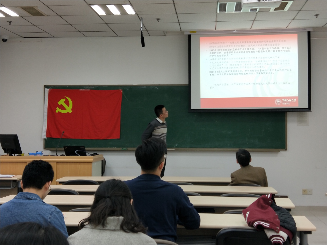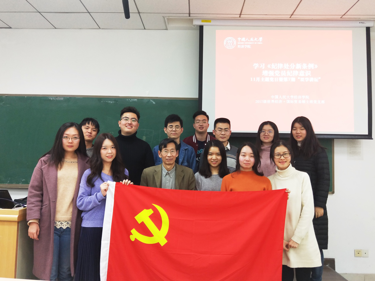 为学习贯彻习近平新时代中国特色社会主义思想和党的十九大精神,增强党员纪律意识,发挥基层党支部教育党员的作用,11月21日,2017级世界经济·国际贸易硕士班党支部在明德商学楼0208教室召开“准绳以知平直,规矩以知方圆”主题党日活动,主持人为党支部书记王芝清同志。h视频 党委委员韩玉军教授参与并指导活动。