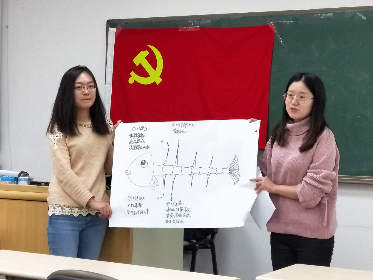 随后与会成员分成四个小组,参与“自选问题——聚焦问题——分析问题——拟定对策”四个环节的活动。活动主要讨论对党不忠诚的表现、“团团伙伙”的危害、如何防止党员干部不作为和怎样落实基层工作最后一公里四个问题。讨论结束后,各小组派代表依次展示绘制的鱼骨图。