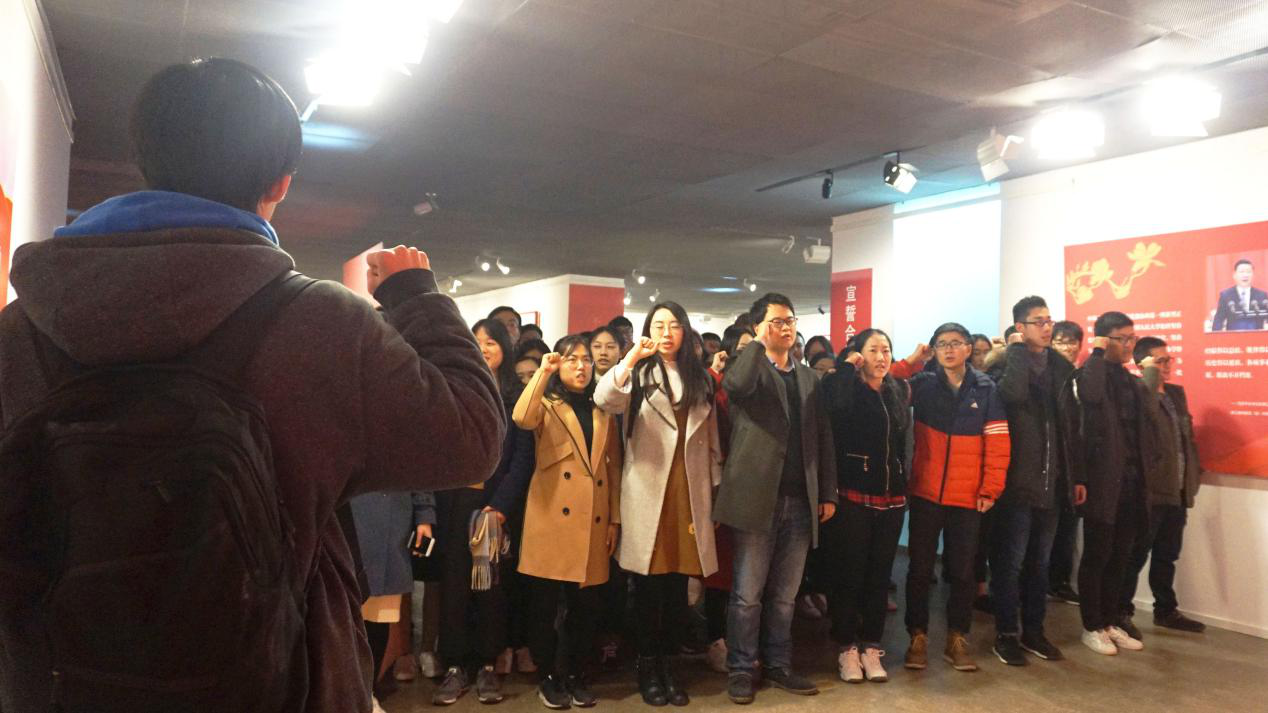 五大展区参观结束后,学员们在党旗下宣誓,表明入党的坚定信念和对党的忠诚。接着,学员们来到观影区,怀着激动的心情观看吴宝康同志生平纪录片,回顾吴宝康同志光辉的一生。