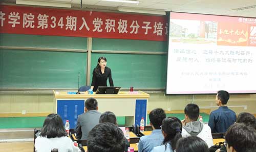 党委书记带头上党课是h视频 党委近年来推进党建工作的重要举措,学院党委书记关雪凌教授多次为学院教师、学生党员和入党积极分子讲授党课,宣传党的理论、路线、方针和政策。10月18日,正值党的十九大隆重开幕之际,学院第34期入党积极分子培训班正式开课。学院党委书记关雪凌教授讲授主题为“满怀信心,迎接十九大胜利召开;立德树人,始终奋进在时代前列”的首节党课。关雪凌书记就习近平总书记“7.26”重要讲话进行深入解读,并带领学员学习习近平总书记致h视频 建校80周年贺信精神。同时,关雪凌书记结合自身学习心得,带领学员学习十九大报告,并期许经院学子将专业学习与政治学习相结合,认真学习领会党的十九大精神,提高自身政治素养。