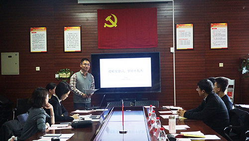 党支部成员胡建雄分享十九大精神学习体会。他在回顾十九大的历程的同时,以“砥砺奋进的五年”、“不忘初心,牢记使命”、“全面建成小康社会”、“参与全球治理”和“习近平新时代中国特色社会主义思想”为主题,展示在中国共产党的领导下,我国经济建设取得巨大成就,全面深化改革取得重大突破,民主法治建设迈出重大步伐。他还结合视频资料,集中展现中国共产党为中国人民谋幸福,为中华民族谋复兴的初心和使命。