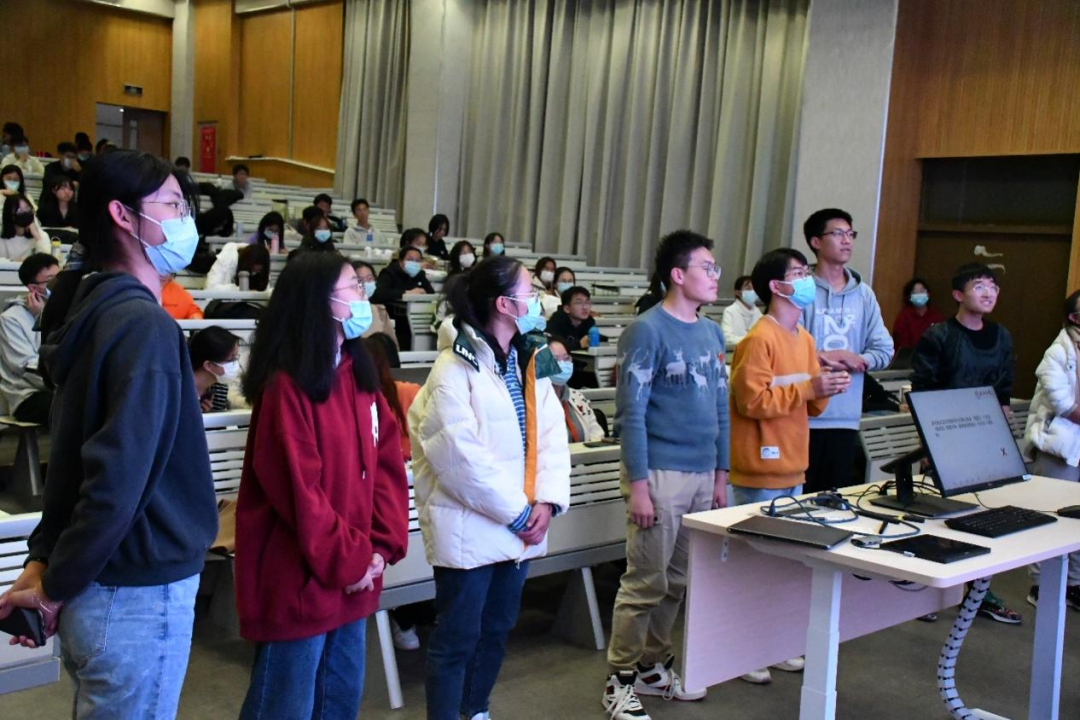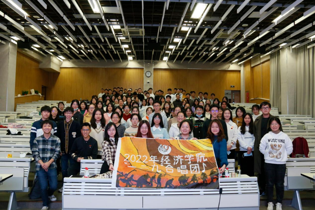 活动最后,同学们共同唱响《南泥湾》。经院合唱团的勋章映着点点灯光,成员的笑颜伴着悠悠乐曲,灵动的歌声满溢整间教室。