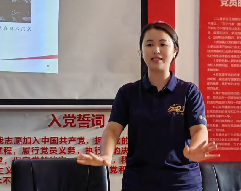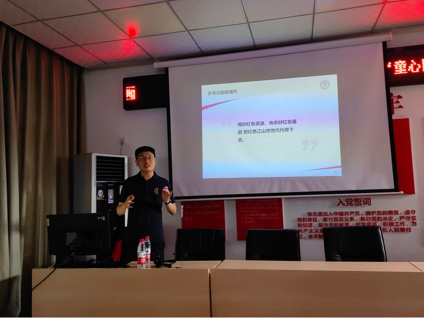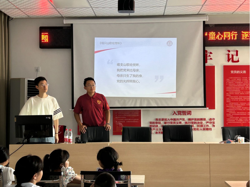 王晗为大家播放庆祝中国共产党成立100周年文艺演出《伟大征程》的片段,并讲述自己亲身参与其中的故事,王晗和张志强共同教学《唱支山歌给党听》,小朋友们齐声高唱红歌的样子令大家倍感振奋。