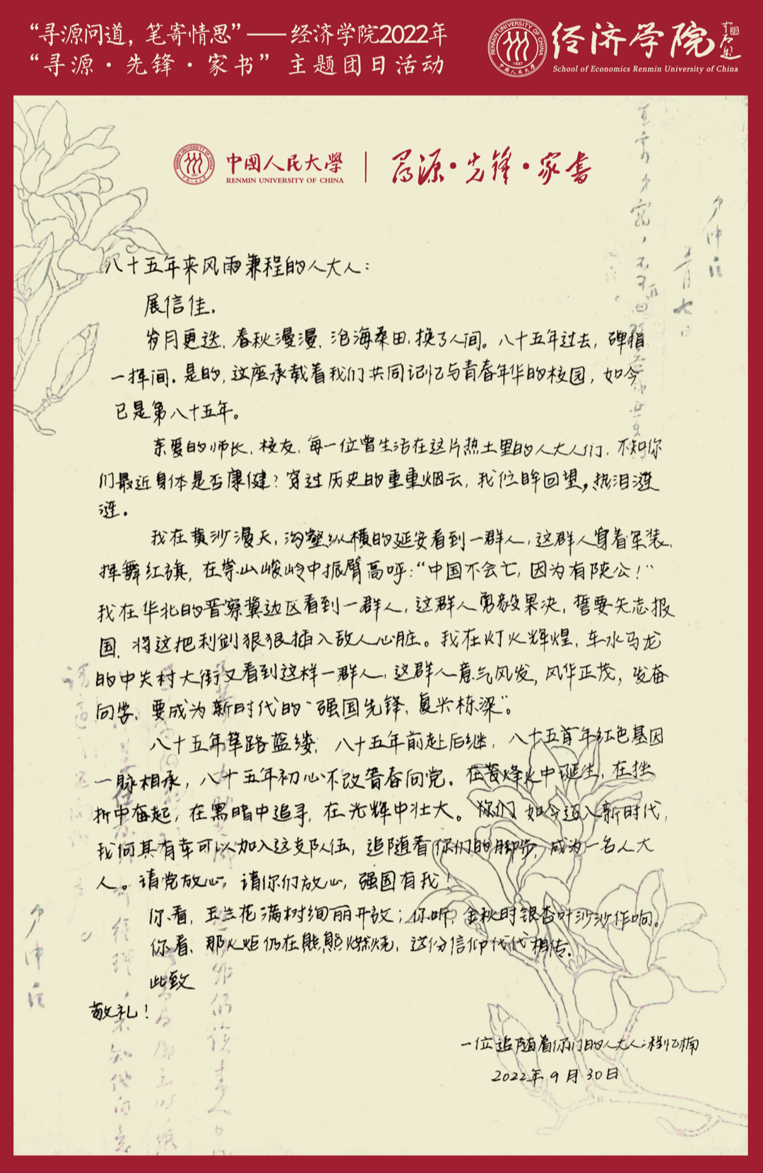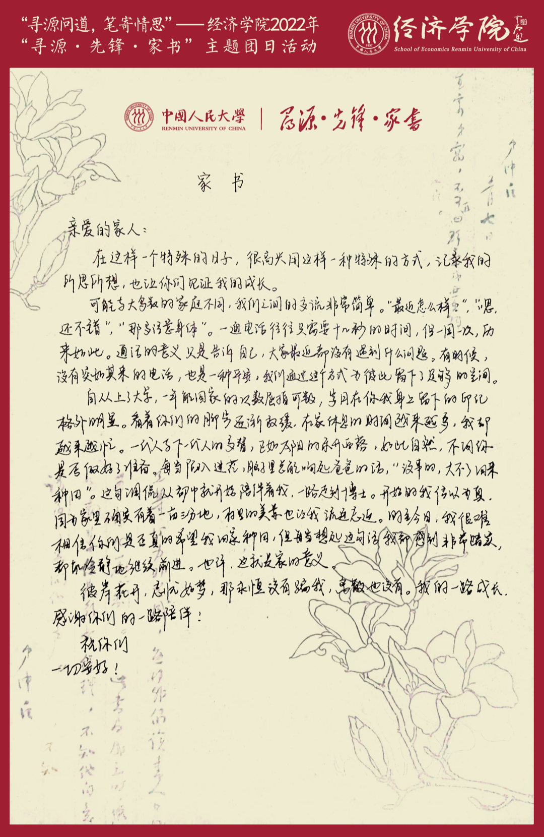 家书是个人志向承托的载体,是与亲友间情感维系的纽带,更是根植于每位中华儿女内心深处的家国情怀。各新生团支部的同学们通过手写“寻源·先锋·家书”,将自己对人大人时代使命的思考付诸笔端。