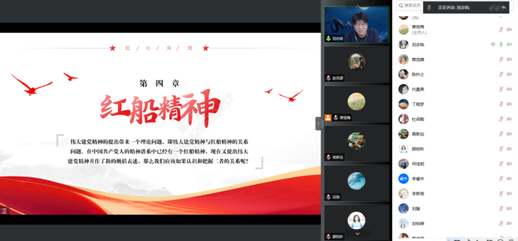 刘志铭从伟大建党精神的重大意义、科学内涵、其作为中国共产党人精神谱系源头的价值及与红船精神的区别和联系四个方面对伟大建党精神进行了多角度的讲解。