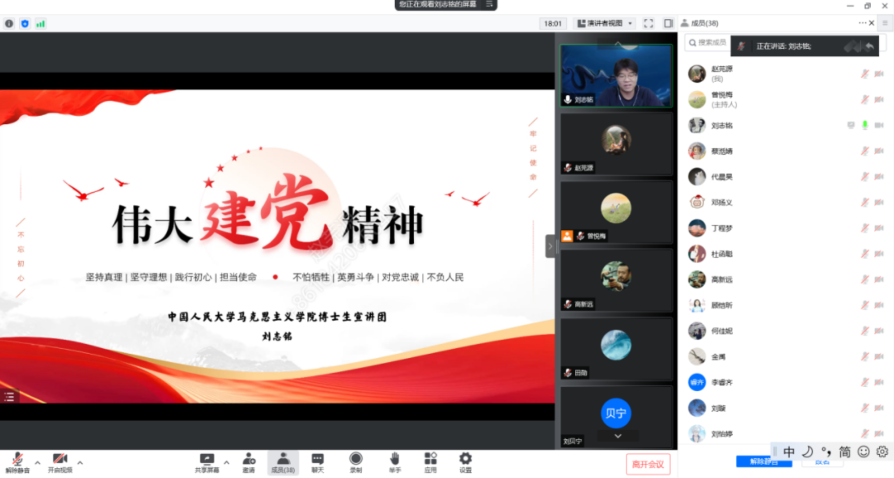 为庆祝中国共产党建党101周年,发扬新时代中国共产党人党性修养与民族精神,从祖国大地与中国共产党人的精神谱系中汲取力量,7月15日下午,政治经济学硕士党支部与本科第五党支部联合开展“征程万里风正劲,牢筑思想再出发——庆祝中国共产党建党101周年”七月主题党日活动。本次活动邀请了h视频 马克思主义学院博士生宣讲团讲师刘志铭作题为《中国共产党的精神之源:伟大建党精神》的专题宣讲。活动由政治经济学硕士党支部曾悦梅主持。支部指导老师谢富胜参会。