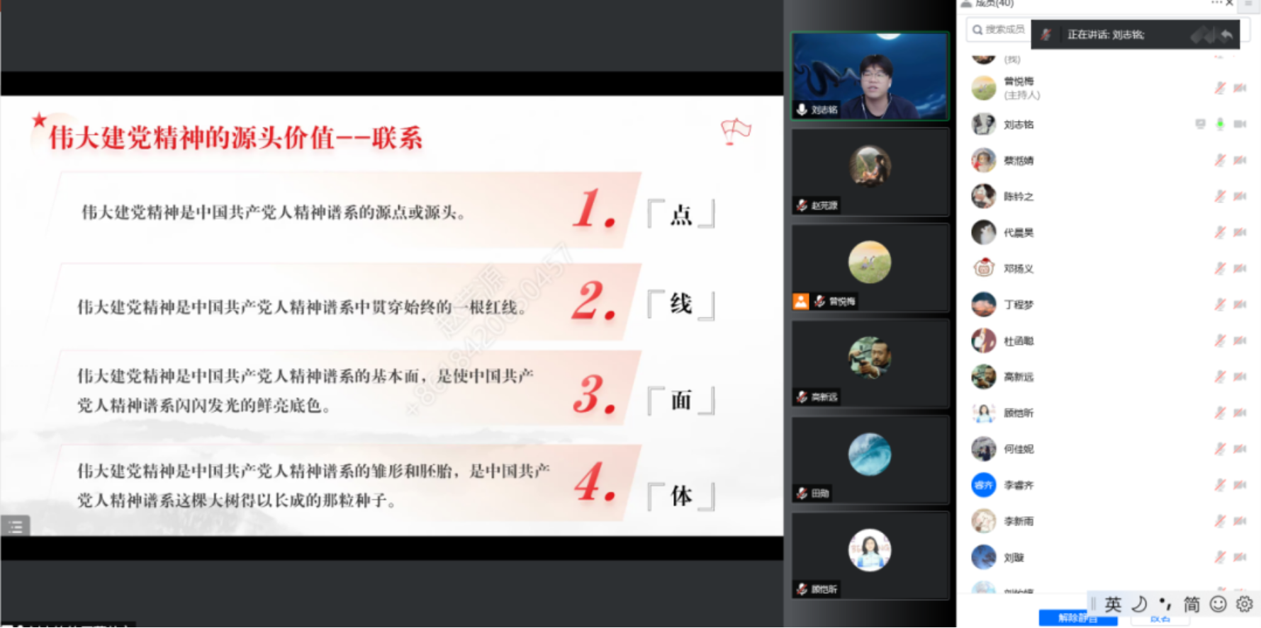 刘志铭分享了对建党精神的科学内涵的理解。从真理与理想,到初心和使命,到牺牲和斗争,到对党忠诚,伟大建党精神的内容是紧密联系、内在贯通的,形成一个有机整体,需要全面学习、整体把握。
