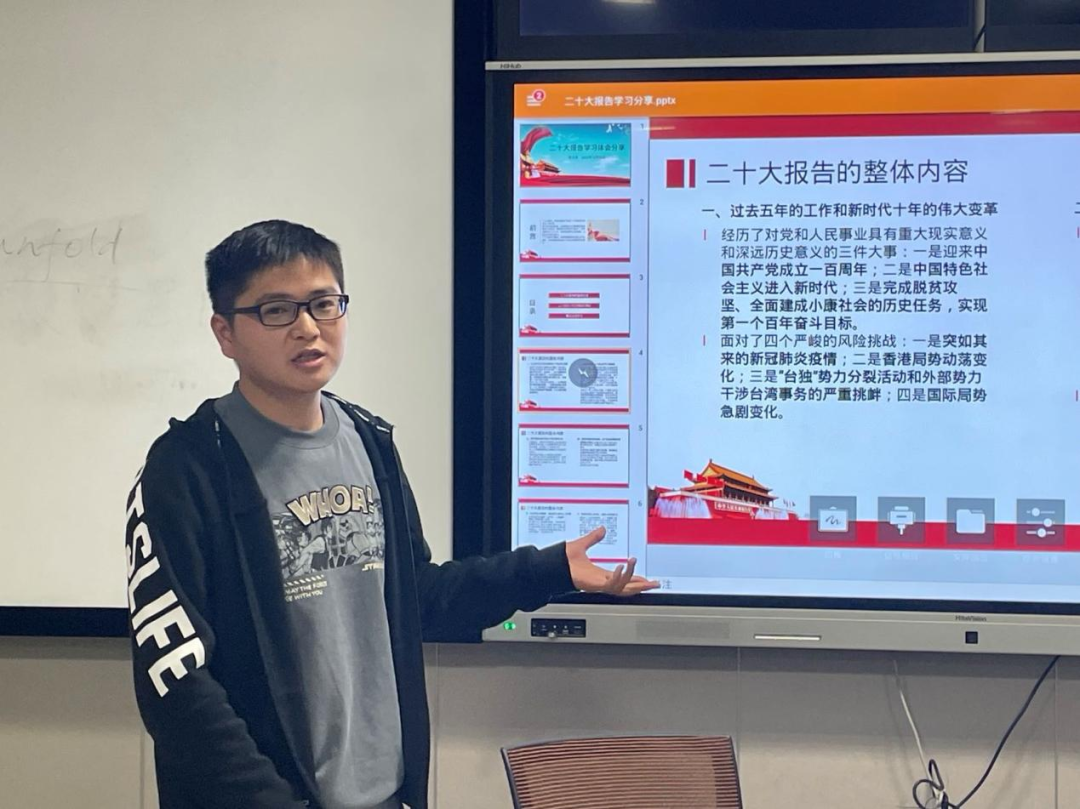 在党的二十大报告中,习近平总书记指出,实践告诉我们,中国共产党为什么能,中国特色社会主义为什么好,归根到底是马克思主义行,是中国化时代化的马克思主义行。这为我们青年博士生指明了思考和研究的方向,我们要从学理化的角度对各种现象进行总结、对各种政策进行解读、对各种问题进行分析、对各种质疑进行回应。我们这一代人出生在世纪之交,又在新时代成长,现在我们需要在党的二十大胜利召开的新历史时刻上坚定人生方向,力争将小我融入大我,在全心全意向着中华民族伟大复兴前进的过程中实现青年价值。作为新时代的青年博士生,我们需要深刻领悟“两个确立”的决定性意义,增强“四个意识”、坚定“四个自信”、做到“两个维护”,始终在思想上政治上行动上同以习近平同志为核心的党中央保持高度一致。要努力在学深、悟透、弄通上下功夫,力争为全面建设社会主义现代化国家、全面推进中华民族伟大复兴而团结奋斗。