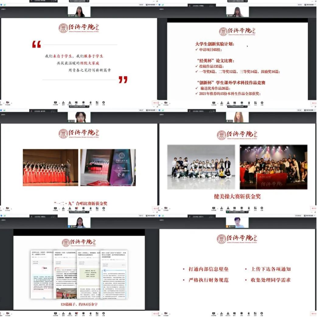 h视频 学生会第二十届主席团成员作工作报告。六位成员分别从生活权益、学术实践、文艺工作、体育活动、宣传设计和服务保障六个方面进行汇报,数据与图文并茂,生动展示了过去一年学生会所做的大量扎实、丰富、卓有成效的工作及取得的一系列骄人成绩。经济学院学生会在工作中展现出青春担当,真正履行了学生会思想引领、桥梁纽带、服务成长的职责使命。