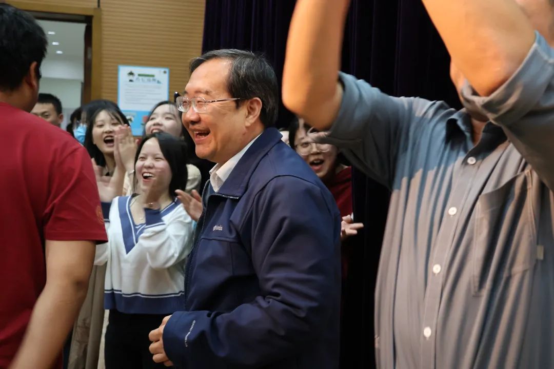 惊喜嘉宾刘守英院长的到来,将晚会气氛掀至高潮。《我的祖国》《洪湖水浪打浪》两首经典歌曲,引起全场大合唱。伴随着欢快热烈的气氛,全场师生脸上洋溢着幸福快乐的笑容。合唱过后,院长亲切地与晚会现场的演员、观众们合影,定格这一精彩瞬间。