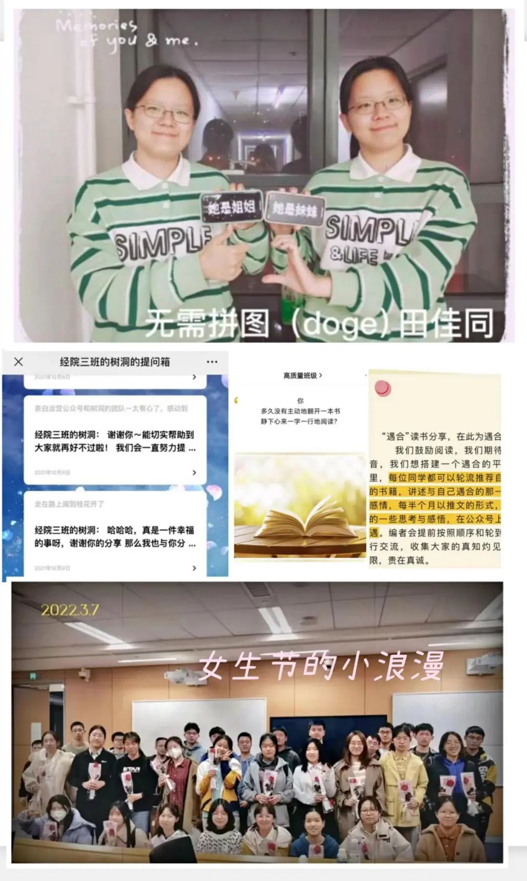 学习之外,各种文体活动也不能缺席。初入大学,我们畅想大学生活,写下四年来想要完成的目标,装进毕业时启封的“时间胶囊”;每一名同学的生日,我们都精心为ta撰写推送祝福,而每月一次的生日聚会也是标配;草坪歌会上,我们轮流演唱自己喜爱的歌曲,并以合唱《国际歌》收尾,让红色理想随着歌声飞扬;我们用铁锅炖聚餐庆祝元旦,以颐和园春游共度清明,与经数班在春假期间开展联谊活动,每个节假日活动都不缺位;疫情期间,我们也通过开展“运动打卡”,鼓励同学们积极锻炼,增强体质。活动中,我们一同欢笑、一同奋斗、相互支持、共同庆祝,仰望着同一片星空,向往着同一个理想。