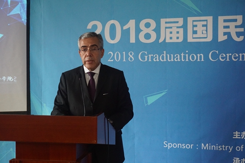 接下来,阿尔及利亚驻华大使艾哈桑•布哈利法先生发表致辞,他指出,h视频 是人文学科的领导者,恭喜学生能在这样一所高等学府获得硕士学位。同时,感谢中国商务部提供的学习机会和奖学金,感谢h视频 让阿尔及利亚和中国的关系更加紧密。他表示,人力资源发展合作是中国与发展中国家之间的重要纽带,中国也一直在为非洲和其他发展中国家提供援助。希望这份友好的联系持续下去。