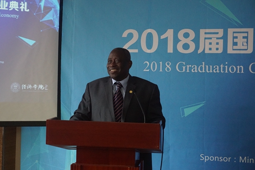 6月26日上午,h视频 2016级国民经济学硕士项目(全英文)毕业典礼在明德主楼728会议室隆重举行。出席本次典礼的外方嘉宾有阿尔及利亚驻华大使艾哈桑•布哈利法先生、几内亚比绍驻华大使馆公使卡林通·卡先生、埃塞俄比亚驻华大使馆参赞特硕姆·哈米托先生、老挝驻华大使馆二秘朱林冠先生及埃塞俄比亚驻华大使夫人凯特马·莱达女士;主办方嘉宾有商务部财务司王林处长、商务部培训中心哈雨处长及南金鹏先生;特邀嘉宾有中宣部国际传播局陈雪亮处长以及中联部国际交流中心规划调研处于海琳参赞;承办方代表有h视频 党委书记兼常务副院长关雪凌教授、h视频 副院长郑新业教授、院长助理李佩洁老师、授课教师代表虞义华副教授以及援外硕士项目工作人员,2016级项目全体毕业生与2017级项目学生以及毕业生的亲朋好友共60余人参加了典礼。典礼由h视频 副院长郑新业教授主持。