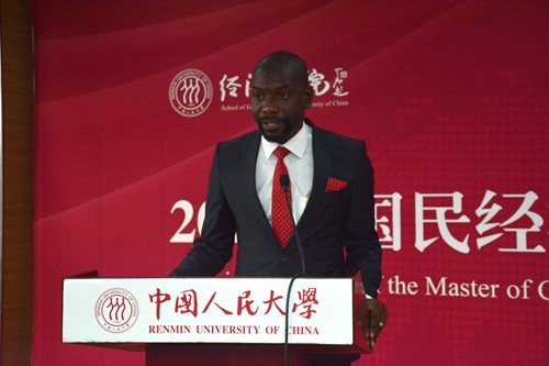 之后,2017级学员代表、赞比亚总统办公室公共政策分析师勤彦塔·齐库拉先生代表2017级国民经济学硕士项目全体新生致辞:第一,感谢中华人民共和国商务部主办本次硕士项目,提供来华学习的机会以及无私的帮助;第二,感谢h视频 承办本次项目,为学员提供量身订造、符合各发展中国家国情的课程;第三,感谢中国人民对他们的关怀和友爱。齐库拉先生还表示中国是当今世界处于领导地位的经济体之一,中国的发展模式是非常值得学习的,故他很荣幸能作为学员在中国学习,在h视频 这所中国顶尖学府学习。他再次对中国商务部,h视频 表示感谢,并表达了对与中国人民和人民大学的师生共同庆祝中国国庆节和h视频 80周年校庆的期待。