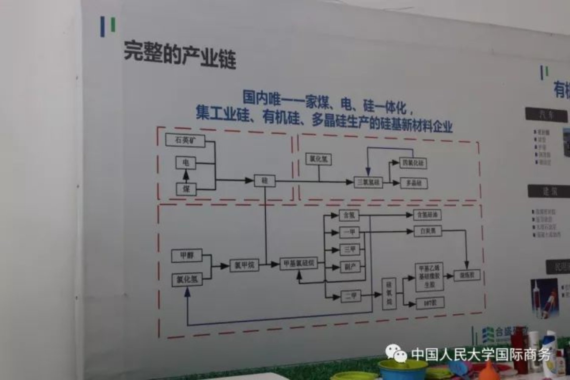 随后,调研团队与陈经理还有部分企管人员座谈,就企业历史情况、经营现状、重组改制过程、经营理念、以及未来展望等方面进行了深入交流。合盛硅业工业硅业务主要集中在新疆等地,当地具有原材料、能源等资源丰富、价格较低的优势,使得公司的工业硅生产具备了明显的成本优势。目前,公司有机硅业务主要集中在浙江,当地及其周边省份有机硅产业链较为完整,下游企业数量较多,显著的区位优势发挥了强大的辐射作用,使得公司更贴近客户和市场,从而提高了拓展客户和服务客户的能力。公司内部工业硅和有机硅生产和研发部门的沟通效率和沟通成本显著优于外部厂商之间的沟通情况,这有利于公司更合理地安排生产计划、协调产品标准、解决技术问题,从而提高生产设备的使用效率,降低成本;同时也有利于公司深入开展工业硅在有机硅生产应用中的机理研究,不断提高研究实力和技术水平。这些优点使合盛硅业成为我国硅基新材料行业中业务链最完整、生产规模最大的企业,也是行业内为数不多的能同时生产工业硅、有机硅及多晶硅,从而形成协同效应的企业之一。