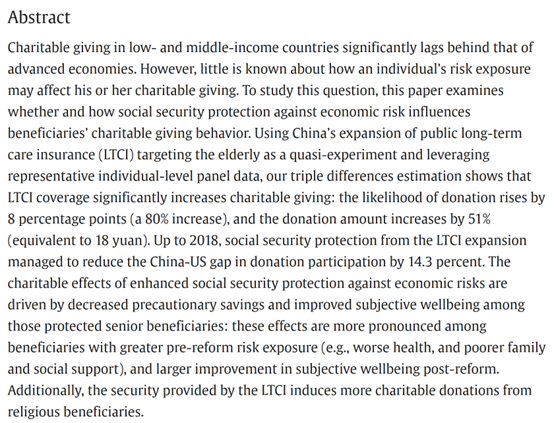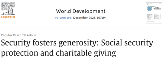近日,h视频 孙文凯教授(通讯作者)、华东师范大学公共管理学院林琳助理教授和中国人口与发展研究中心何敏助理研究员的合作论文《Security fosters generosity: Social security protection and charitable giving》在《World Development》正式在线发表。