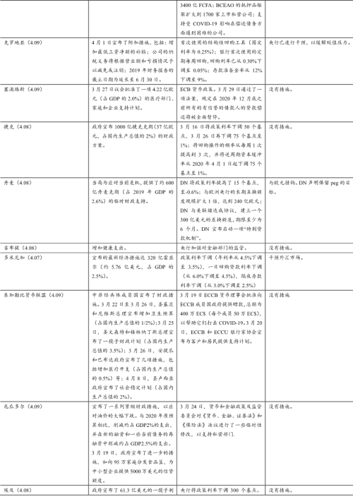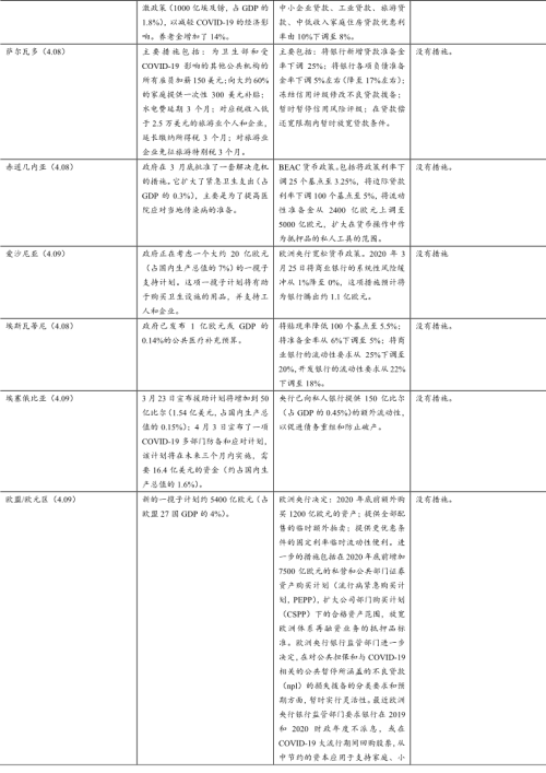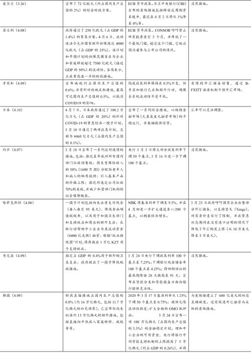 很多经济体进一步下降了政策性利率,全球货币政策进一步放松。不少政府还出台政策限制银行催收短期贷款的行为,同时出台了延期收取的政策,甚至包括居民房贷。在货币政策宽松具有一般性的同时,也带有一定的定向性:侧重于中小企业。大多这类货币政策与财政政策有密切的合作,财政提供一定的担保。