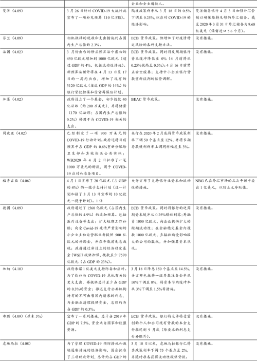 政府担保促进企业信贷几乎成为这一阶段全球宏观政策的新特点。比如,法国新预算法预计将在4月13日至17日的一周内出台增加了现有的3120亿欧元(接近GDP的14%)的银行贷款担保和信贷再保险计划;佛得角对所有中小型企业(270万欧元)和所有行业的微型企业(约670万欧元)提供100%的贷款担保;等等。