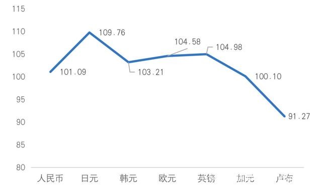 当数字低于100时,则表示该国货币相对1月份出现升值。图2的数据表明,自年初以来,卢布兑美元升值接近9%,加元对美元汇率基本稳定,其他国家均不同程度出现贬值。其中人民币贬值约1%,欧元和英镑贬值约5%,而日元贬值接近10%。