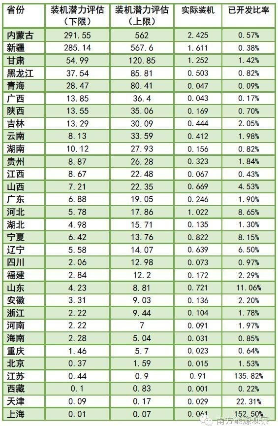 表1.各省风电装机潜力与实际装机量(2015)