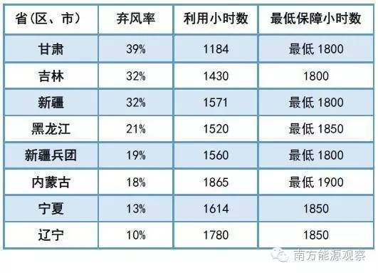 表3. 各省弃风率、利用小时数(2015年)与最低保障小时数