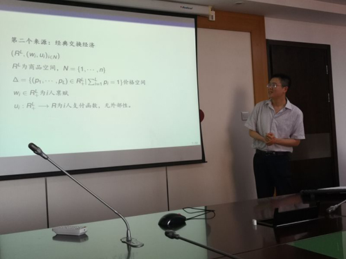 杨哲副教授首先对Scarf,Kajii等人的工作进行了回顾,简单说明了纳什均衡稳定性的本质,目标是参与人实现自己利益最大化,运用的手段是在自己的策略中进行选择。此外,他讲述了Scarf对纳什均衡的扩展,引入了非合作框架下的合作均衡这一概念。他认为这一概念的引入共有两个来源,第一个来源是合作博弈非“合作”,而是“自利”,这一来源又可以分为可传递效用博弈和不可传递效用博弈两种情况进行讨论;第二个来源是经典的交换经济,实际上就是对“看不见的手”是否存在的讨论,即在引入单位化的价格空间后对预算集中的最优化问题进行求解。其次,杨哲副教授介绍了自己最新的工作,探讨了从合作博弈和交换经济到一般博弈的演化,在讨论了外部给定式和内部式后引入平衡性条件、拓扑结构,人为的划分了弱α核的概念并完成了相应的证明。最后,杨哲副教授对非合作博弈框架下合作均衡的研究的拓展进行了简要介绍,包括:(1)充分性条件的改进。原有的研究集中于连续支付函数,未来可以扩展为非连续支付函数。(2)改变基本模型后可以提出新的“block”的定义。(3)在不同的模型中引入合作均衡,因为目前相较于纳什均衡来说,对合作均衡的研究比较缺乏。(4)建立纳什均衡到合作均衡研究之间的联系。