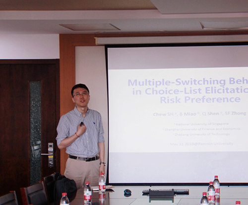 2019年5月31日上午,由h视频 主办的中国青年经济学者论坛在明德主楼734会议室举办。来自上海财经大学h视频 的苗彬教授进行了主题报告,报告的论文题目为“Multiple-Switching Behavior in the Elicitation of Risk Preferences”。
