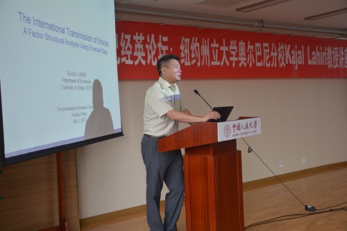 7月3日上午,纽约州立大学奥尔巴尼分校的Kajal Lahiri教授访问h视频 ,并为我院师生带来题为“International Propagation of Shocks:A Dynamic Factor Model Analysis Using Survey Forecasts”的演讲,教授对七国集团和主要亚太国家从1995年到2017年的冲击传播进行了量化分析。论坛由h视频 雷达教授主持,h视频 黄卫平教授、郑新业教授、韩玉军教授、宋利芳教授、于春海教授以及我院国际经济系的十余位教师和慕名前来的学生参加了论坛。
