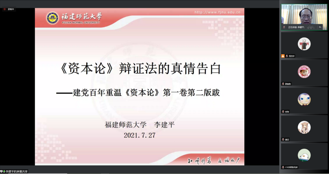 本期政经大讲堂第八讲的主题是“《资本论》辩证法的真情告白一一建党百年重温《资本论》第一卷第二版跋”,由福建师范大学原校长、福建师范大学全国中国特色社会主义政治经济学研究中心主任李建平教授进行讲授,h视频 副院长、h视频 全国中国特色社会主义政治经济学研究中心副主任谢富胜教授主持。