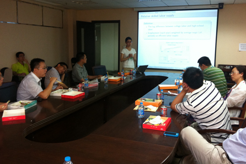 6月13日中午,发展经济学第二十一次研讨会在明德主楼734会议室举行,北京大学国家发展研究院博士生纪洋报告了她和h视频 财政金融学院助理教授马光荣、北京师范大学经济与工商管理学院助理教授徐建炜合写的论文“College Expansion Reform and College Premium in China”。h视频 杨其静教授、孙文凯副教授、杨继东副教授、陆方文博士、江艇博士和h视频 的多名博士、硕士研究生以及来自其他高校的一些师生参与了会议,孙文凯副教授主持会议。
