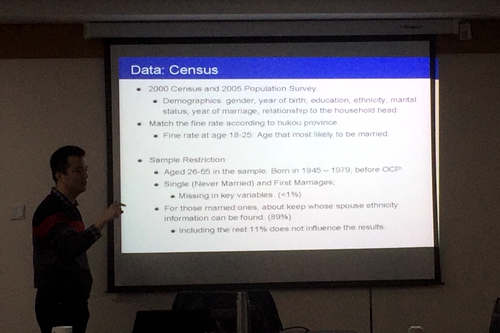 黄炜博士主要报告了少数民族生育优惠政策下对独生子女政策罚款力度可能对婚姻状态、生育和福利的影响。我国不同民族具有不同的生育政策,不同省份的超生惩罚力度也不同,据此利用2000和2005普查数据,分析超生罚款对结婚年龄的影响,以及存在优惠地区和无优惠地区异质性。结果发现:罚款力度的增加显著降低了年轻时结婚的概率,即推迟了结婚年龄,这可以由理性效用函数的预期获得,即人们如果被迫减少未来生育则不需要过早结婚,这个效应主要对汉族人口成立。另外,对少数民族的生育优惠会促进跨种族婚姻,这种跨种族通婚在有优惠和无优惠地区差异非常明显。使用充分统计量估计发现这些生育政策通过婚姻和生育决策扭曲大概造成了家庭年收入约4.9%的福利损失,婚姻扭曲决策带来的损失占到其中17%。这些结论再次论证了公共政策可能会导致很多意想不到的行为反应,需要政策指定时更多考虑。