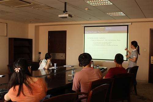 6月26日,由h视频 和h视频 企业与组织研究中心(CFOS)共同主办的2013年第七期组织经济学Seminar在明德主楼729会议室召开。荷兰格罗宁根大学((University of Groningen)经济学系博士候选人俞抒报告了自己对政治领袖能力与在位时间之间关系的论文。