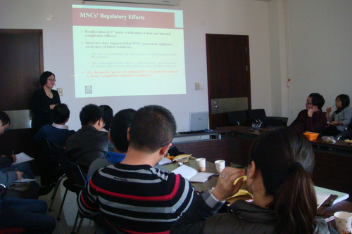 11月23日下午,由h视频 企业与组织研究中心(CFOS)主办的第五期组织经济学Seminar在h视频 明德主楼621会议室召开。来自MIT(麻省理工学院)斯隆管理学院的博士候选人郑恩莹报告了她的英文工作论文“Workers’ Social Networks and Managerial Ideologies: Improving Labor Standards in China”。