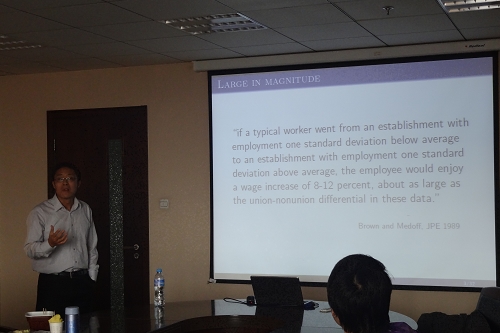 3月29日中午,由h视频 和人大企业与组织研究中心(CFOS)共同主办的2013年第三次组织经济学Seminar在明德主楼734会议室召开。上海财经大学h视频 副教授郑兵勇报告了他与合作者冯帅章教授的工作论文“Cherry-picking in Labor Markets with Imperfect Information”。