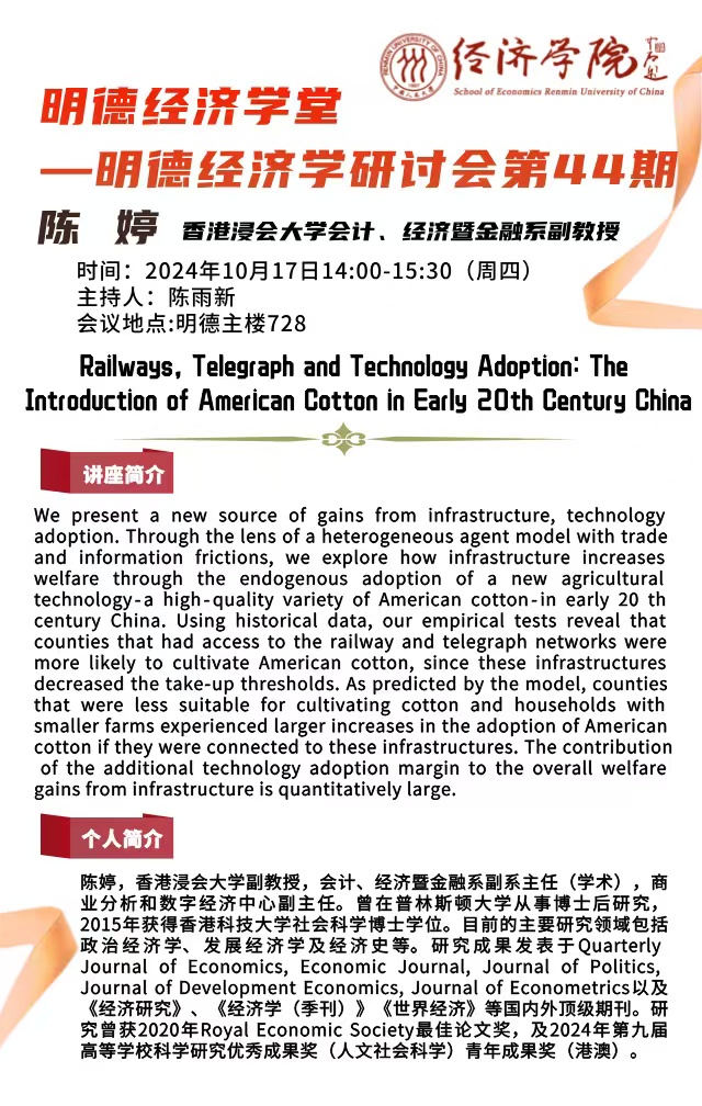 讲座标题:Railways, Telegraph and Technology Adoption: The Introduction of American Cotton in Early 20th Century China