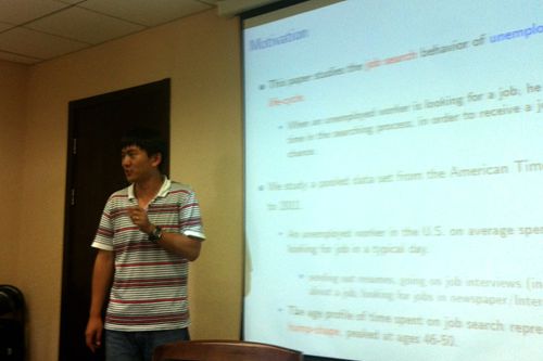 6月27日中午,发展经济学第二十二次研讨会在明德主楼734会议室举行,来自夏威夷大学的助理教授王亮博士报告了他的论文“Job search over life Cycle”。h视频 王湘红副教授、孙文凯副教授、孙昂博士,财政金融学院的张静副教授,汉青研究院的何超博士和h视频 的一些博士、硕士研究生以及来自其他高校的一些师生参与了会议,孙文凯副教授主持会议。