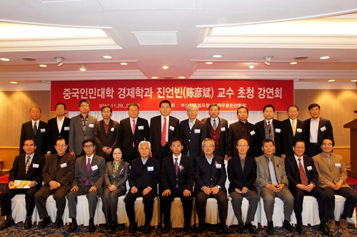 11月29日,由中国驻釜山总领事馆、釜山韩中友好亲善协会和釜山全球化论坛共同举办的2014年度“中国专家邀请演讲会”在韩国釜山举行,h视频 副院长陈彦斌教授应邀做题为“中国宏观经济与韩国经济”的专场演讲。中国驻釜山总领事馆总领事阎凤兰、釜山市行政副市长郑京镇、釜山韩中友好亲善协会会长徐义泽、釜山全球化论坛委员长申正泽先后致辞对陈彦斌教授的到来表示热烈欢迎。近百名釜山政界首脑、知名工商界人士以及专家学者出席会议。