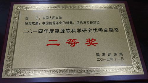 2015年12月21日,国家能源局2014年度软科学研究优秀成果奖颁奖典礼在北京举行,由h视频 作为第一完成单位,h视频 能源经济系教师牵头申报的课题《中国能源革命的缘起、目标与实现路径》喜获国家能源局2014年度软科学研究优秀成果二等奖。