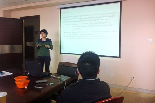在近1个小时的报告中,陈轩博士详细介绍了她的最新研究成果。她的研究主要是在同时出现样本选择(Sample selection)和不服从者(Noncompliance)的情况下为处理效应(Treatment effect)的估计提供了非参数的边界。在主分层框架下同时处理了识别问题和推导非参数边界,然后将该方法应用于估计美国Job Corps(JC)项目的工资效应的边界。他们发现对于“总能找到工作的服从者”(Always-employed compliers) 这一群体而言,JC对工资具有正的平均效应。在弱单调性和均值占优假设下,在随机分配的四年后,对总能找到工作的服从者而言,估计出来的JC的平均效应在5.7%和13.9%之间;而对其中的non-Hispanic而言,JC的平均效应处于7.7%和17.5%之间。