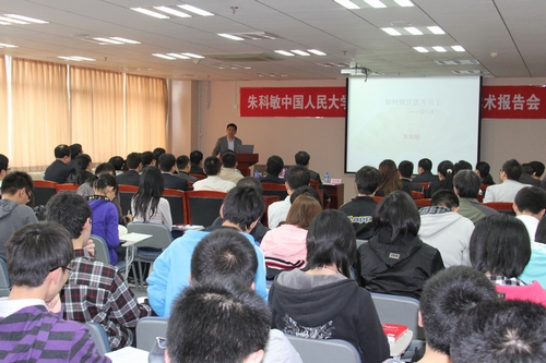 随后,朱科敏教授发表了题为《如何留住企业员工》的学术演讲。他对多年来管理东海证券的经历进行理论的高度概括总结,提出自己独到的见解。首先是对管理本质的定义。认为本质是“授权”。而管理的使命承担者是“人才”。接着,他又对人才进行了自己的定义:忠诚、有能力、懂执行的人是人才的标准。而管理的关键是“执行”,管理的中心是“如何留住优秀的员工?”那么,依靠什么留住员工?他认为“利益、情感、理想”这三个要素最重要,并认为h视频十分重要。朱科敏教授以其多年管理实战经验,为在场学生上了一堂生动的社会实践课程。