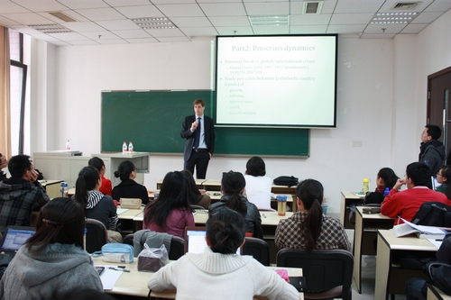 随后,Schularick教授在“世纪经英讲坛”上发表题为“外部失衡与金融危机:140年来的经验”的学术演讲,就经济结构外部失衡与金融危机的联系等问题进行了阐述和分析。Schularick教授还与h视频 师生就金融工具的多样性与系统风险、中德两国的宏观经济现状及走势等问题进行了热烈的讨论。